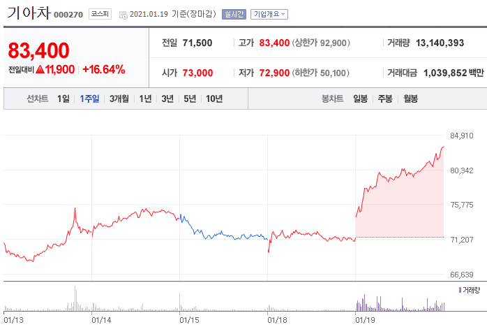 기아차 주가는 2012년 5월 이후 처음으로 16.64%오른 8만 3400원에 19일에 장을 마쳤습니다.
