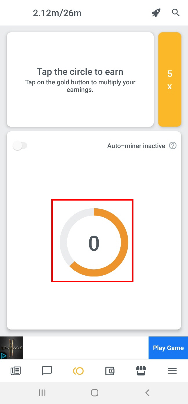 수동채굴은 아래와 같이 정 가운데 동그란 탭을 1분동안 손가락으로 두드려주는 방식으로 수동 채굴을 하실 수 있습니다. 수동모드에서 채굴량은 자동모드의 최대 100배까지 된다고 합니다.