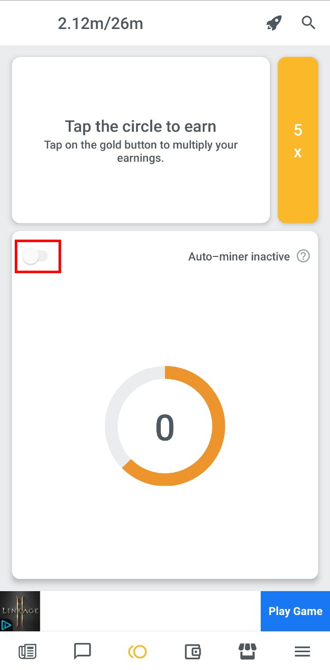 자동채굴은 사진에 보시는 빨간 부분의 스위치를 ON(노란색이 보이도록) 해주시면 되고 24시간 마다 접속해서 다시 off된 스위치를 켜주기만 하면 됩니다.