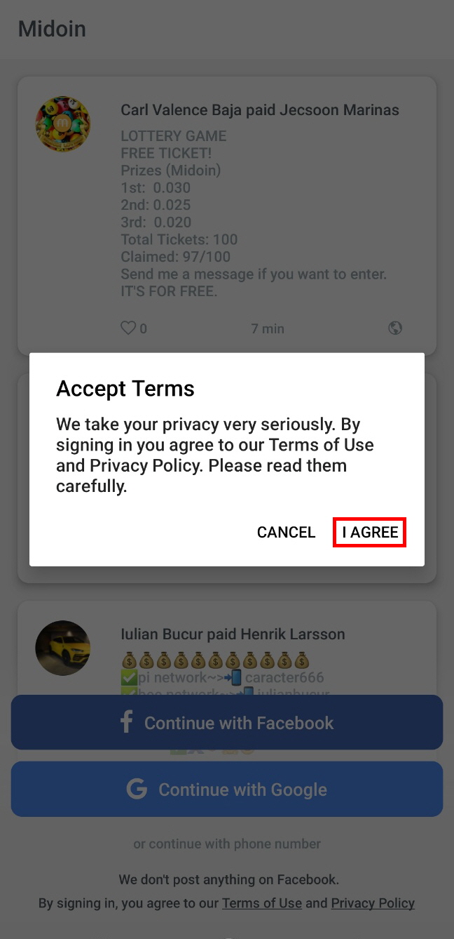 미도인(Midoin) 앱 실행을 하시면 페이스북 or 구글 계정 연동을 하라는 메세지가 보입니다. 원하시는 계정으로 연동을 하시면 "I AGREE"를 클릭 하시고 넘어 가시면 됩니다.