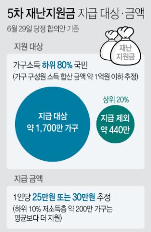 정부와 더불어민주당이 5차 재난지원금 지급 대상을 소득 하위 80%로 6월 29일 결정을 하였습니다. 합의안은 마련됐으나 전국만 지원의 당의성을 주장하는 목소리가 여전히 나오고 있으며, 국회 논의 과정에서 불확실성 및 지급 대상을 선정하는 과정에서 논란도 있을것으로 보여집니다.