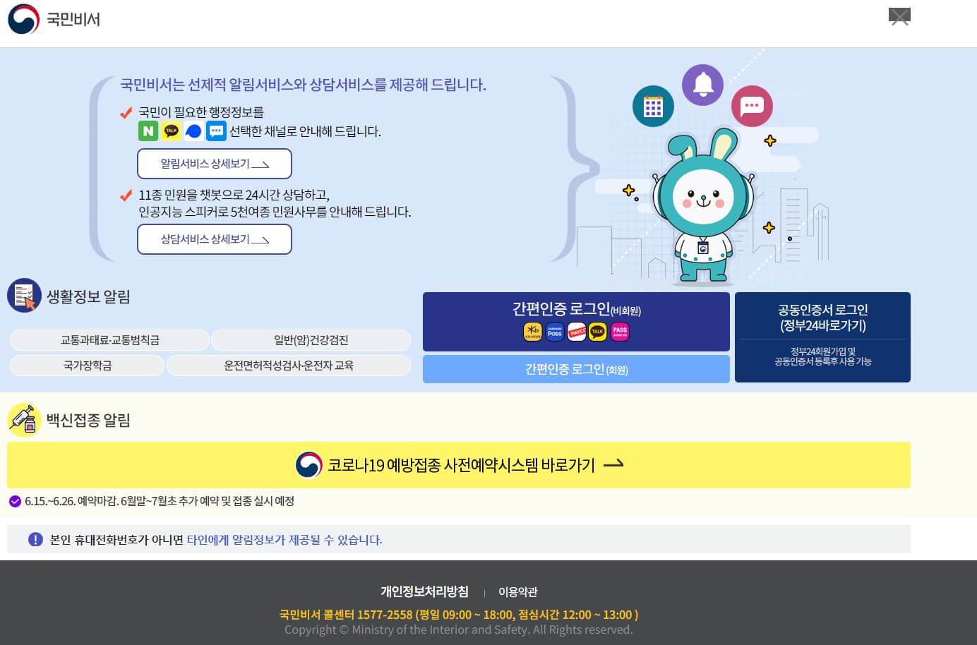 추가로 알아두시면 좋은 사이트는 국민비서 홈페이지(ips.go.kr) 사이트입니다. 국민비서 서비스는 교통 과태료 등 생활 정보를 검색할 수 있는 시스템이지만 코로나19 정보 안내를 추가로 서비스 하고 있습니다. 국민비서 홈페이지에 들어 가거나 앱을 다운 받아 안내를 신청하면 접종예약 확인, 하루 전 접종 안내, 당인 접종 주의사항, 3일 후 이상 반응 대처 방안 등을 안내 받을 수 있습니다.