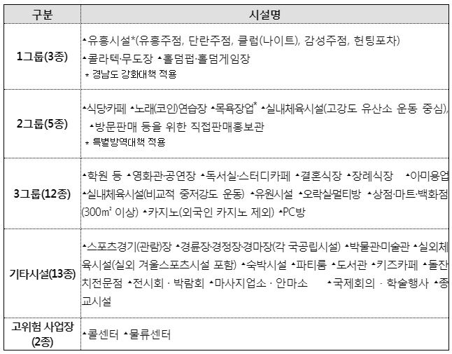- 유흥시설과 노래연습장, 목욕장업 방문 판매 오후 10시부터 다음날 오전 5시까지 운영 제한