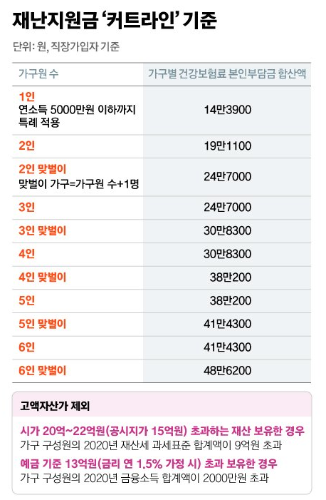 또한, 정보는 재난지원금 지급에 건강보험료를 산정할 때 쓰는 기준을 활용하여, 6월분 건강보험료 합산액이 하위 80% 이하에 해당하는 경우 지급하는 것이 기본 원칙이며, 즉 해당 기준 금액보다 건강보험료를 덜 냈다면 재난지원금을 받을 수 있다는 이야기 입니다.