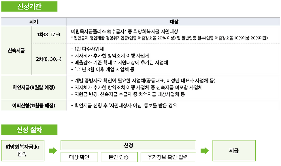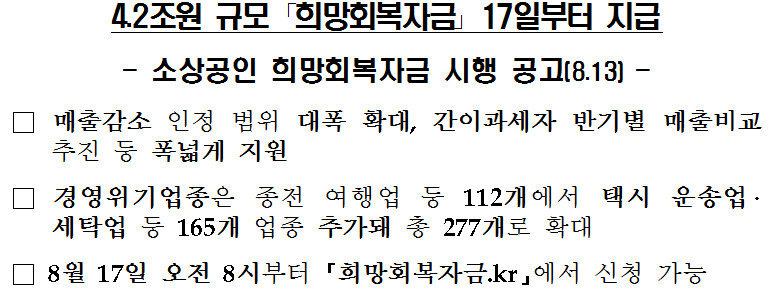 8월 17일 ~ 20일은 신청 시간대에 따라 하루 4차례로 나눠서 재난지원금이 당일 낮부터 순차 지급된다고 밝혔으며, 지급받기 위해 미리 온라인 누리집(홈페이지) "희망회복자금.kr"에서 신청할 수 있으며, 신청은 본인인증을 위해 본인 명의 휴대전화 또는 공동인증서(법인은 법인명의 공동인증서)를 준비해두시길 바랍니다.