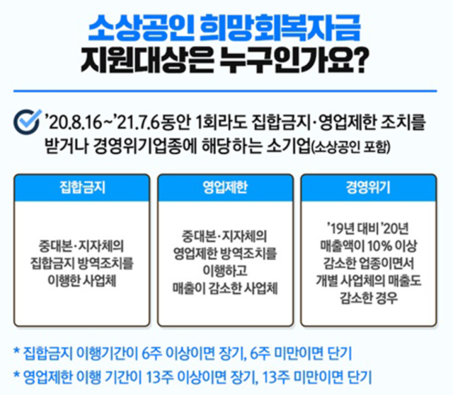 희망회복자금은 집합금지, 영업제한/경영위기 업종 등 크게 3개 유형으로 세분화하여 지원하기로 하였습니다. 지난해 8월 16일부터 올해 7월 6일까지 정부의 집합금지 조치로 영업을 하지 못한 사업체에 최대 2000만원이 지원되며, 지급합금지 기간이 6주 이상인 사업체는 400만원~2000만원, 6주 미만인 곳은 300만원 ~ 1400만원을 받을 수 있습니다.