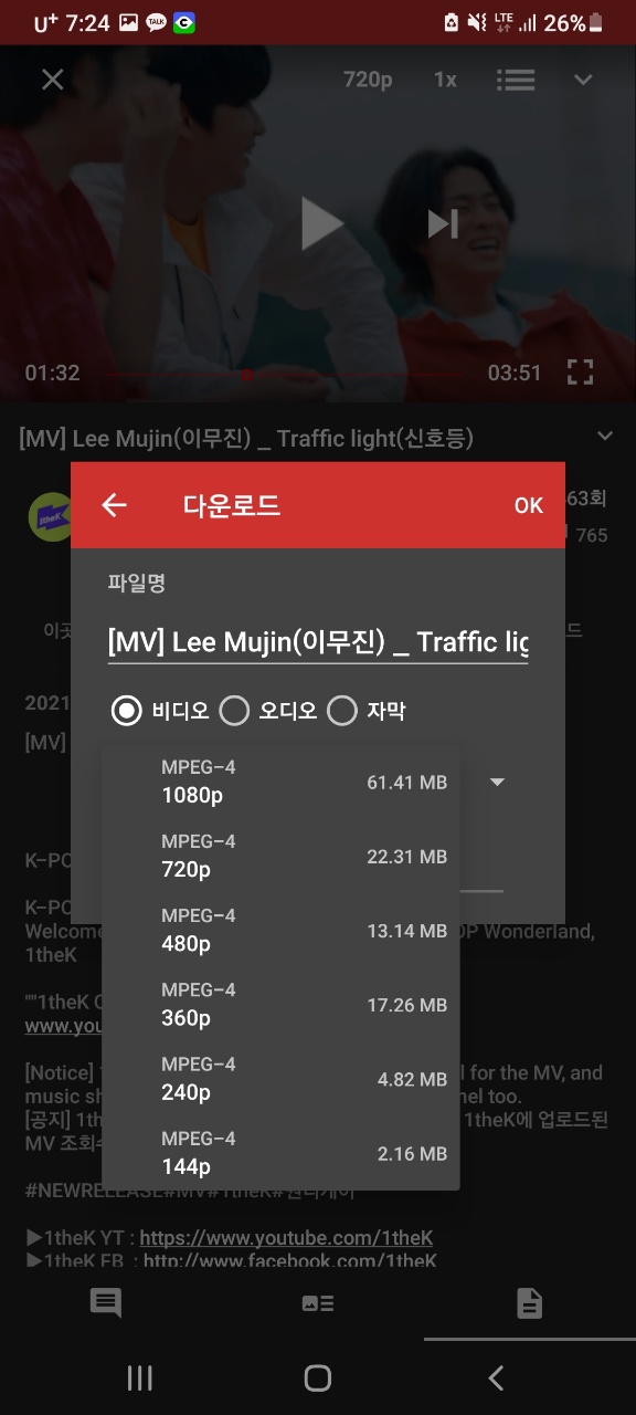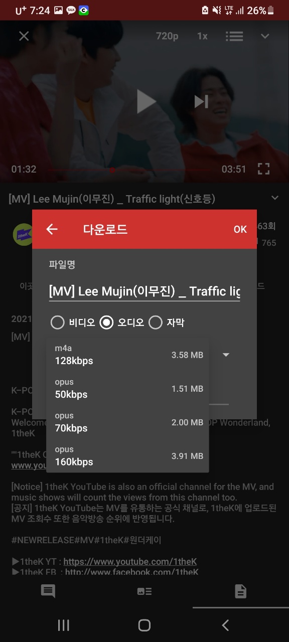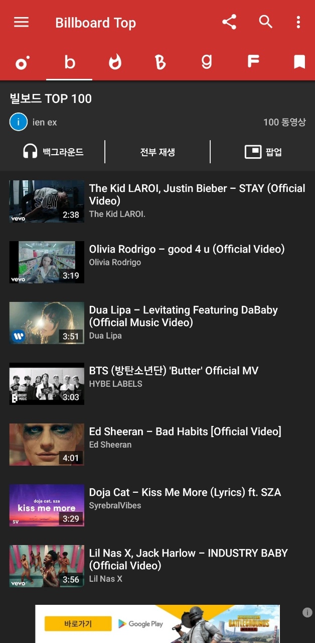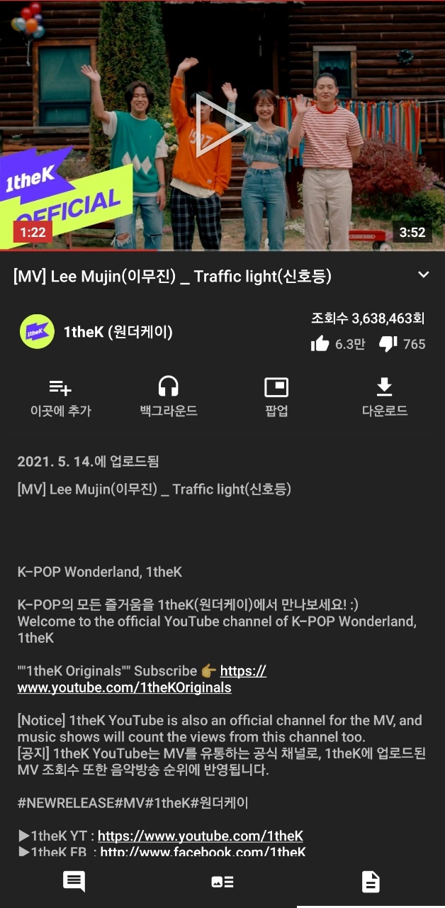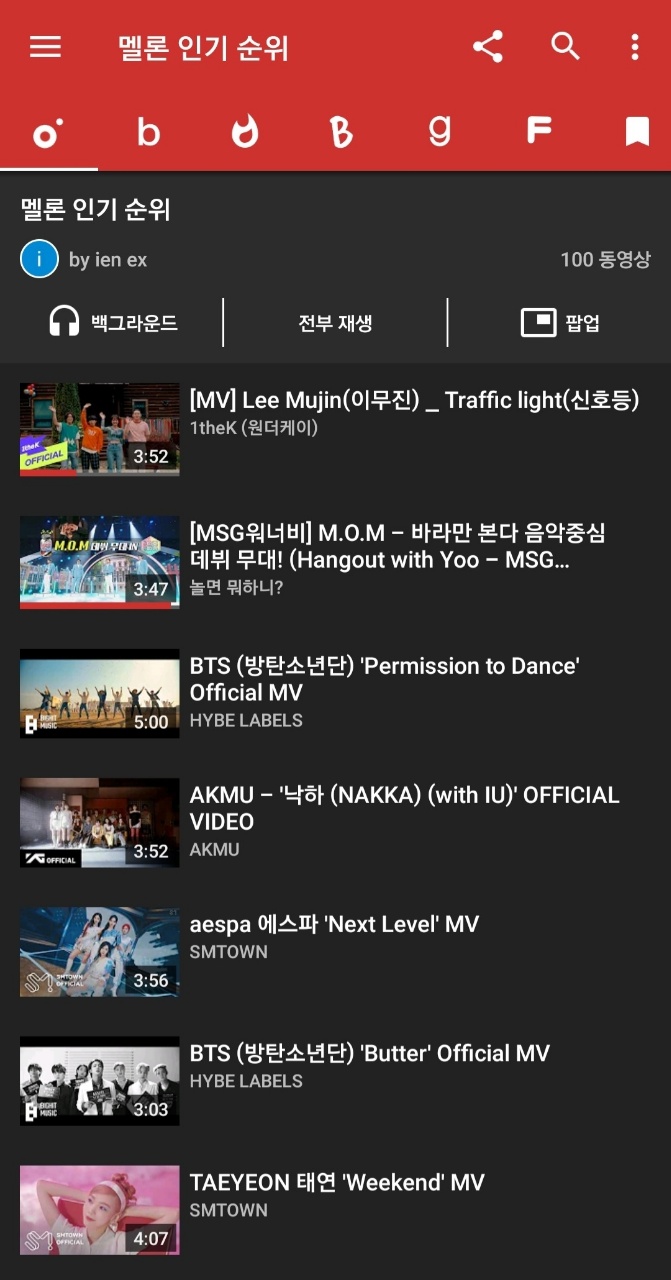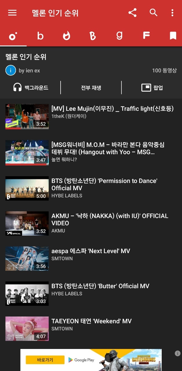 또한, 뮤직비디오는 안보고 음악만 듣고 싶다는 분들은 " 백그라운드"를 클릭하시면 스마트 폰에서 음악만 재생이 되며, 화면을 끄더라도 음악은 계속해서 재생이 됩니다.