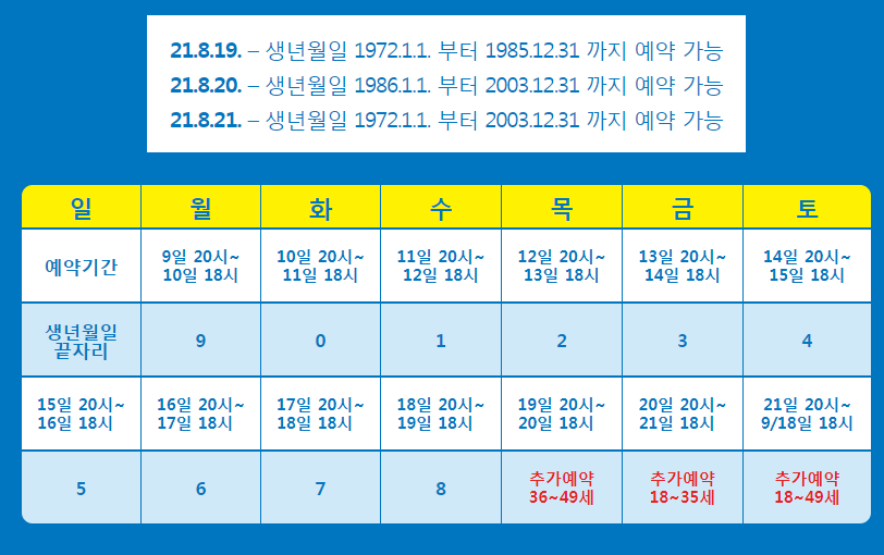 - 18세 ~ 29세(전 연령층 ) : 8월 21일 오후 8시부터 9월 18일 오후 6시 까지