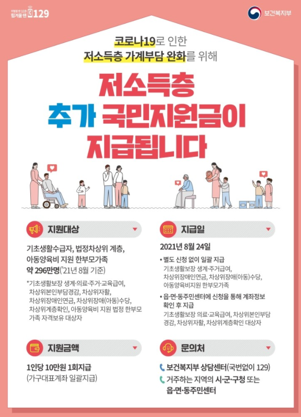 - 저소득층 국민지원금 1인당 10만원 1회 지급