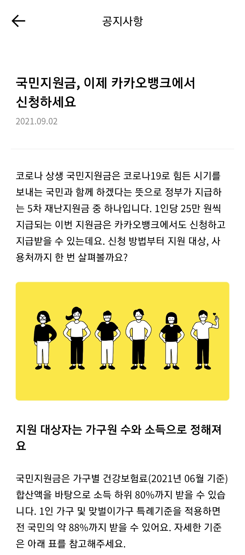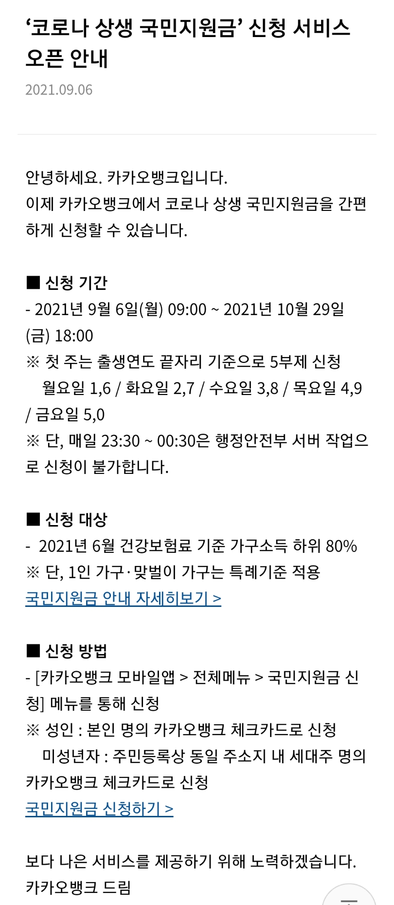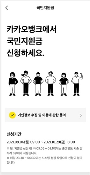 9월 6일부터 카카오뱅크에서 코로나 상생 국민지원금(5차 재난지원금) 신청 서비스를 오픈하였으니 카카오뱅크 어플만 실행하면 팝업창이 바로 뜨게 되어 있어 아주 간단하게 5차 재난지원금을 신청 할 수 있습니다.