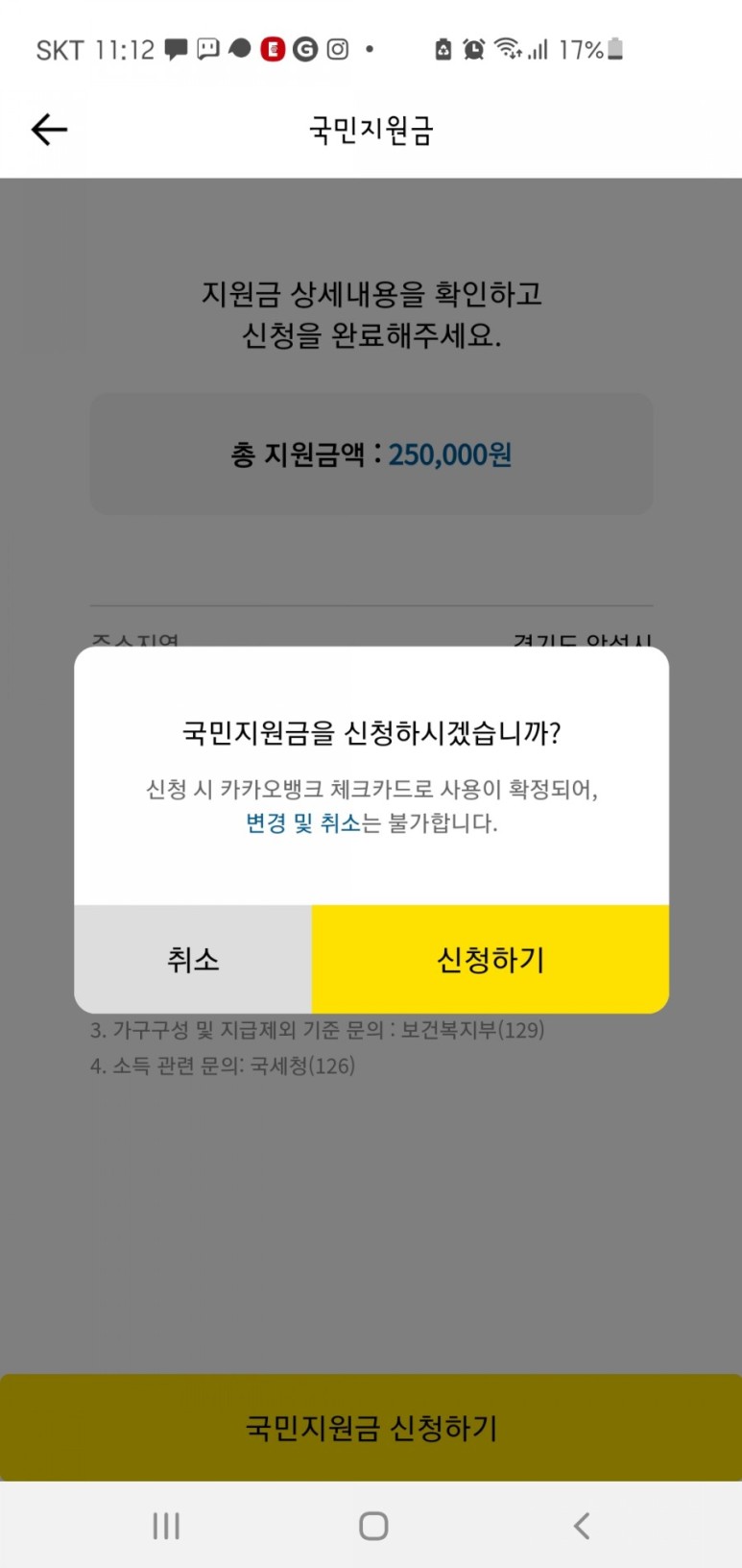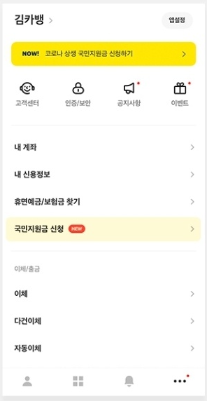 - 카카오뱅크 모바일앱 -> 전체메뉴 -> 국민지원금 신청 ->메뉴를 통하여 카카오뱅크 5차 재난지원금 신청
