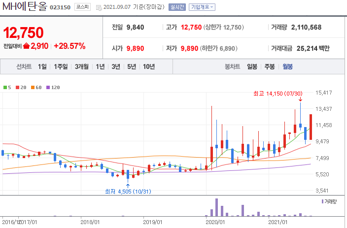 9월 7일 오후 1시59분 기준 MH에탄올(12,750원, 29.57%)은 전 거래일 대비 2910원(29.57%)오른 1만 2750원을 기록하였습니다. MH에탄올은 진해오션리조트 지분 60.48%를 보유한 최대주주이며, 위이에서 이야기 하여듯이 홍준표 의원이 경남도지사 시설 추진하였던 진해 웅동 복합리조트 사업이 재조명을 받자 테마주로 엮이면서 강세를 보였습니다.