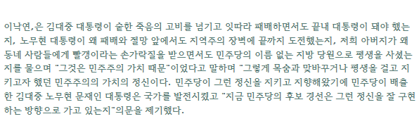 그는 김대중 대통령이 숱한 죽음의 고비를 넘기고 잇따라 패배하면서도 끝내 대통령이 돼야 했는지, 노무현 대통령이 왜 패배와 절망 앞에서도 지역주의 장벽에 끝까지 도전했는지, 저희 아버지가 왜 동네 사람들에게 빨갱이라는 손가락질을 받으면서도 민주당의 이름 없는 지방 당원으로 평생을 사셨는지를 물으며 "그것은 민주주의 가치 때문"이었다고 말하였습니다.