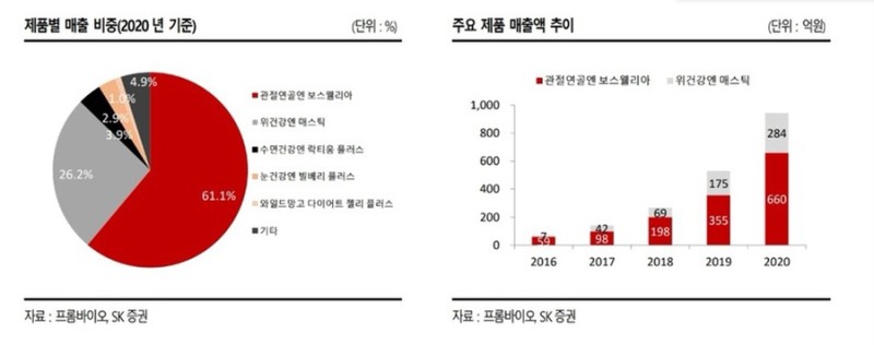또한, 프롬바이오는 홈셔핑, 커머스, 라이브에서 "매스틱, 보스웰리아" 등의 건강기능식품을 만들며, 판매비중 60%를 차지하고 있는 "보스웰리아"는 "관절연골 제품 시장에서 점유율이 무려 1위를 유지중에 있는 상품이며, 매스틱 상품 또한 전체 매출의 23% 비중을 차지하는 위장약으로 식물성 원료를 사용한 점을 강조하고 판매를 하고 있습니다.