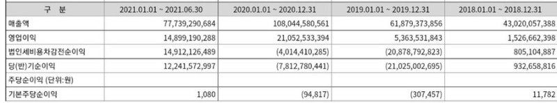 프롬바이오는 2018년부터 매출은 꾸준하게 증가하는 추세이며, 2020년 실적은 매출액 1080억원으로 영업이익 210억원으로 증가하였지만 당기순손실는 적자를 기록하였습니다. 하지만 2021년 상반기는 매출액 777억원으로 영업이익 148억원으로 당기순이익이 122억원 흑자를 기록하였습니다.