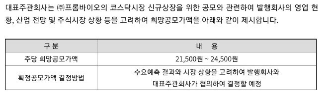 상장을 앞두고 있는 프롬바이오 공모주 청약에 많은 관심이 커지고 있으며, 프로바이오의 총 공모주식 수는 300만주로, 공모 희망 밴대는 2만 1500원에서 2만 4500원이며, 회사는 이번 공모주 청약을 통하여 밴드 상단 기준 최대 735억원을 조달한다는 계획을 밝혔습니다.
