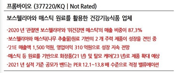 프롬바이오는 건강기능식품 전문기업으로 "보스웰리아, 매스틱, 와일드망고, 다이어트젤리, 유산균, 오메가3, 감마리놀렌산 등등"취급하고 있으며 건강기능식품 제조 및 매매업체 입니다.
