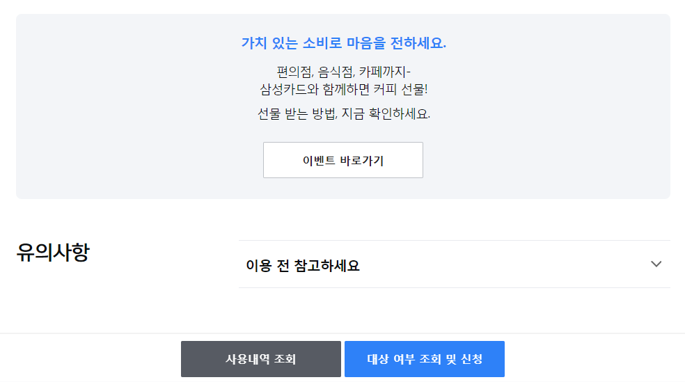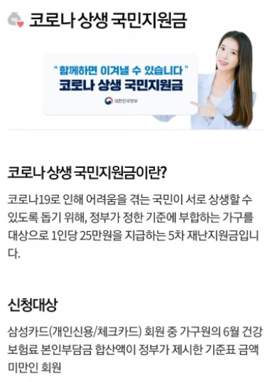 삼성카드 홈페이지에 접속하시면 바로 위 이미지가 보이실텐데, 여기서 대상여부 조회 및 신청을 클릭하시면 재난지원금 신청 및 대상여부 조회가 가능하십니다.