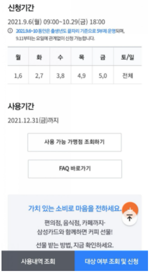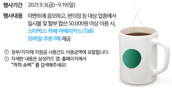 삼성카드에서는 9월 19일까지 스타벅스 커피 모바일 쿠폰을 제공하는 행사도 진행하고 있습니다. 정부/지자체 지원금 사용건도 이용금에 포함이 된다고하니 참고 하시길 바랍니다. 더욱 자세한 사항은 삼성카드 홈페이지에서 확인을 하시길 바랍니다.
