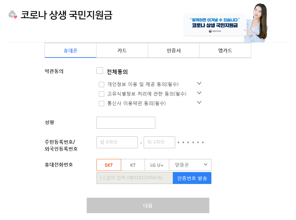 코로나 상생 국민지원금 신청을 위해서는 "휴대폰, 카드, 인증서, 앱카드" 4가지 중에서 인증을 해야넘어 갈 수 있습니다. 카드 및 인증서, 앱카드는 살짝 번거로움이 있는거 같아서 저 같은 경우에는 휴대폰 번호로 간단하게 인증 절차를 진행하고 넘어갔습니다.
