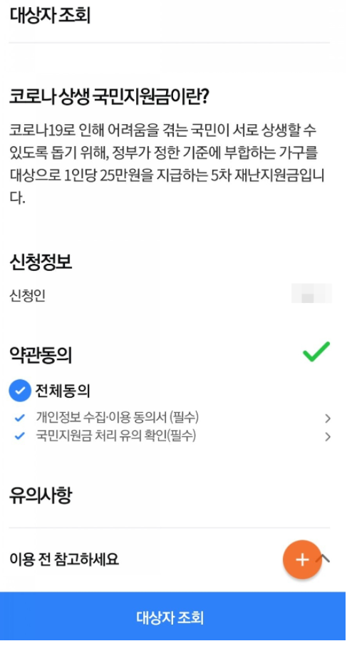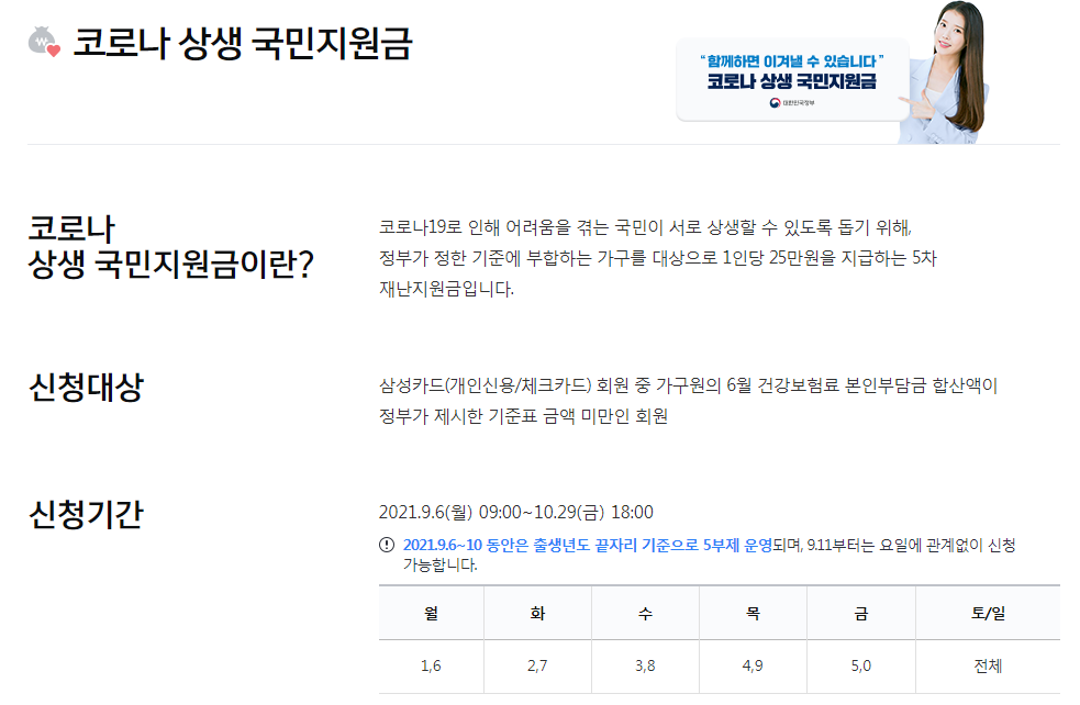 끝나지 않는 코로나 19로 인하여 어려움을 겪는 국민이 서로 상생할 수 있도록 돕기 위하여, 정부가 정한 기준(건강보험료)에 부합하는 가구를 대상으로 1인당 25만원을 9월 6일부터 5차 재난지원금 신청을 받고 지원금을 지급하고 있습니다.