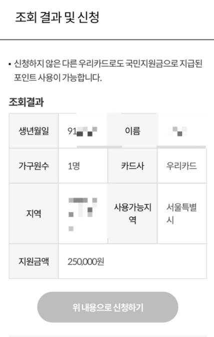 우리은행 재난지원금 신청에 관련한 모든 절차가 끝나면 위 사진처럼 조회 결과 및 신청 이미지를 보실 수 있습니다. 가구원수에 따라 우리은행 재난지원금 금액이 입금이 될거며, 1인당 25만원이니 4인 가족 같은경우 100만원 재난지원금을 받으실 수 있습니다.
