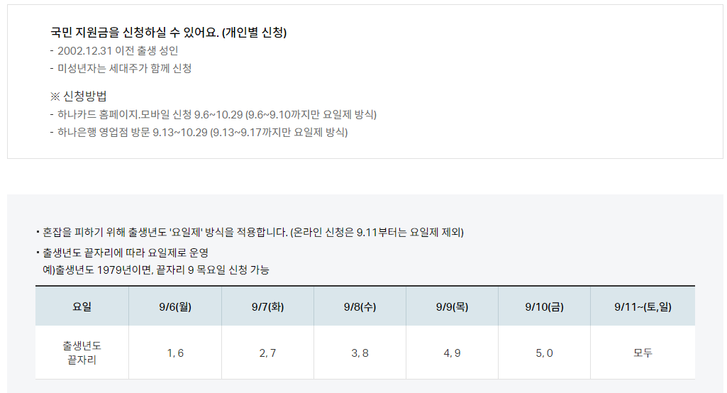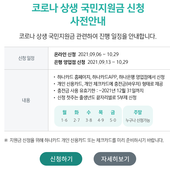 하나은행 재난지원금 신청가능한 곳은 "하나카드 홈페이지, 하나카드 어플, 하나은행 영엄점에서 신청이 가능하며, 개인 신용카드, 개인체크카드에 충점금(바우처) 형태로 제공되며, 충전금 사용 기한은 2021년 12월 31일까지입니다.