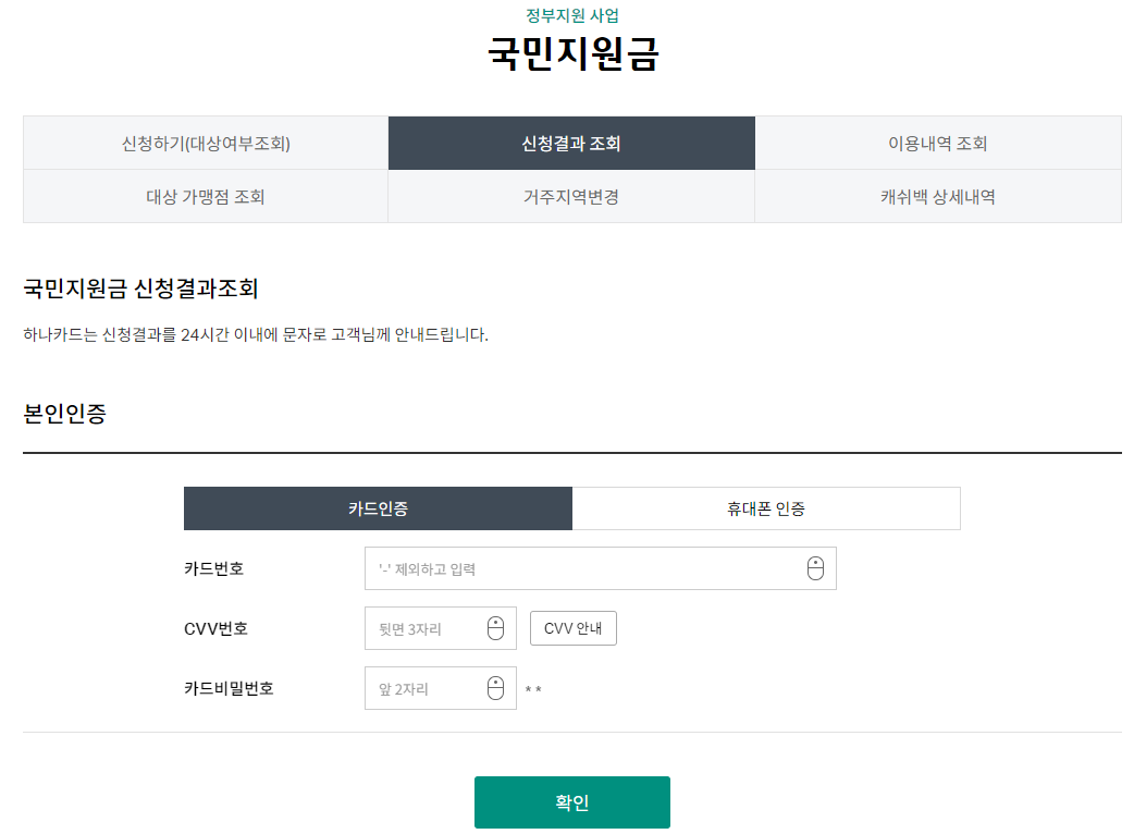 하나은행 재난지원금 신청 홈페이지에 들어가시면 위 이미지처럼 본인인증 절차가 있을겁니다. 인증 절차는 "카드인증 or 휴대폰 인증"이 있으며, 여기서 간단하게 진행하실 수 있는 인증절차를 하시면 되겠습니다.