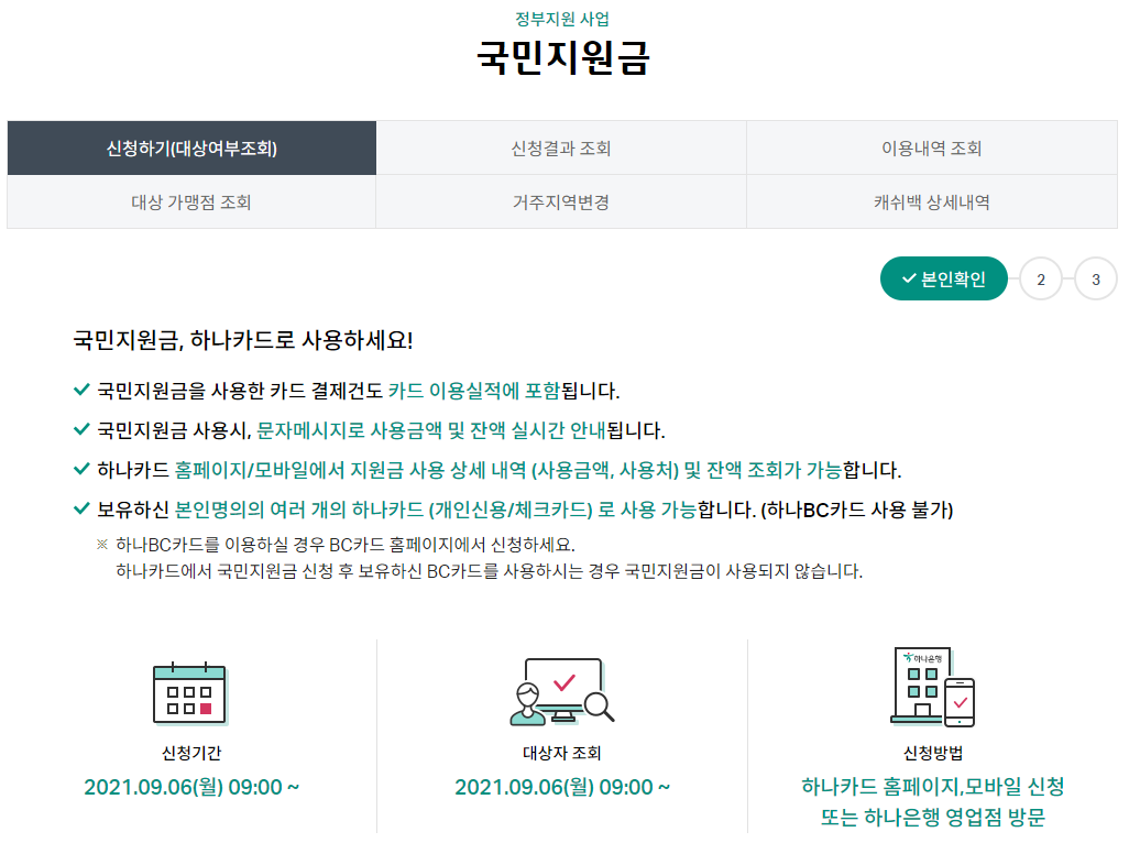 하나은행 홈페이지 및 하나카드 어플에 들어가시면 메인 화면에 "코로나 상생 국민지원금"이 보이실겁니다. 그걸 클릭하시고 들어가셔서 하나은행 재난지원금 신청을 하실 수 있습니다.