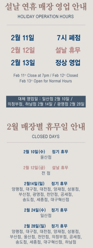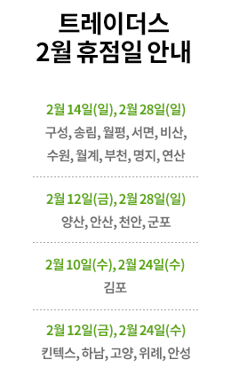 - 대형마트 휴무는 2월은 14일(일요일), 28일(일요일)에 휴점 합니다