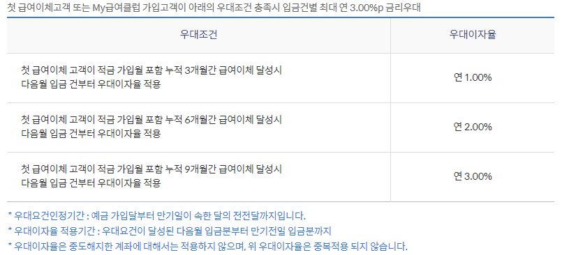- 첫 급여이체 고객이 적금 가입월 포함 누적 9개월간 급여이체 달성시 연 3.0% 우대이자율 적용