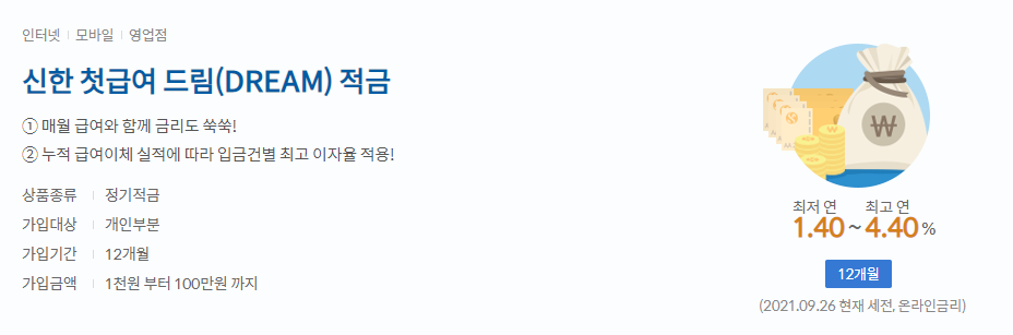 - 신한은행 신한 첫급여 드림 적금 가입 사이트 : bank.shinhan.com