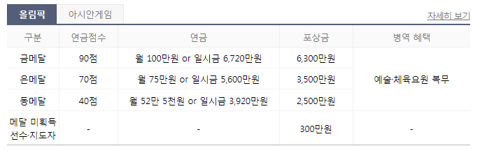 - 국민체육진흥공단에서 메달리스트에게 평생 지급하는 금액