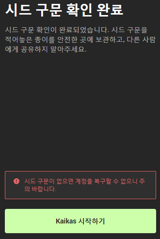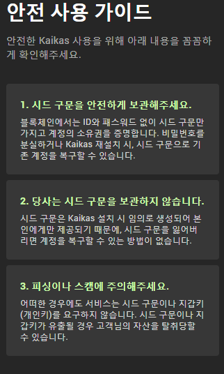 코인지갑은 신원증명이 없기 때문에 비밀번호를 읽어버렸을 때 복구하기 위해 반드시 시드구문이 필요하며, 시드문구를 읽어버리거나 노출되어 해킹을 당할 위험도 있고 만약 해킹을 당하였다면 지갑을 다시 살릴 수 없기 때문에 수시로 안전한곳에 보관하는 것을 추천 드립니다.