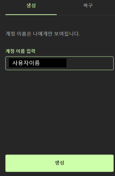 비밀번호를 입력을 하고 난 다음 계정 이름 입력이 있는데 계정 이름은 본인의 실명으로 등록을 해주시는 걸 추천을 드립니다. 아무렇게 하여도 입력은 되지만 최근 국내거래소의 송금 정책이 바뀌고 있어 실명 인증을 해야 하는 경우가 있으니 실명으로 설정 후 추후 변경을 하시는걸 추천 드립니다.