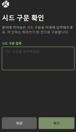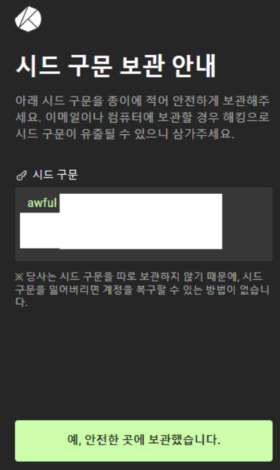 계정 비밀번호 및 계정 이름까지 입력을 하였다면 코인 지갑 중 가장 중요하다고 할 수 있는 "시드구문"입니다. 시드구문은 종이에 적어 놓거나 메모장에 입력을 해놓거나 개인이 보관할 수 있는 곳에 꼭 보관을 해주셔야 합니다.