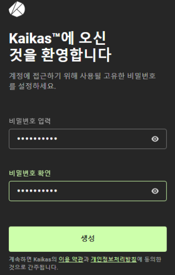 위 이미지대로 카이카스 지갑을 확장 프로그램에 추가하고 고정을 하셨다면 아래의 이지미 처럼 "카이카스에 오신것을 환영합니다"라는 메세지를 보실 수 있으며 그 아래에는 사용할 비밀번호를 입력하는 칸이 있으실겁니다.
