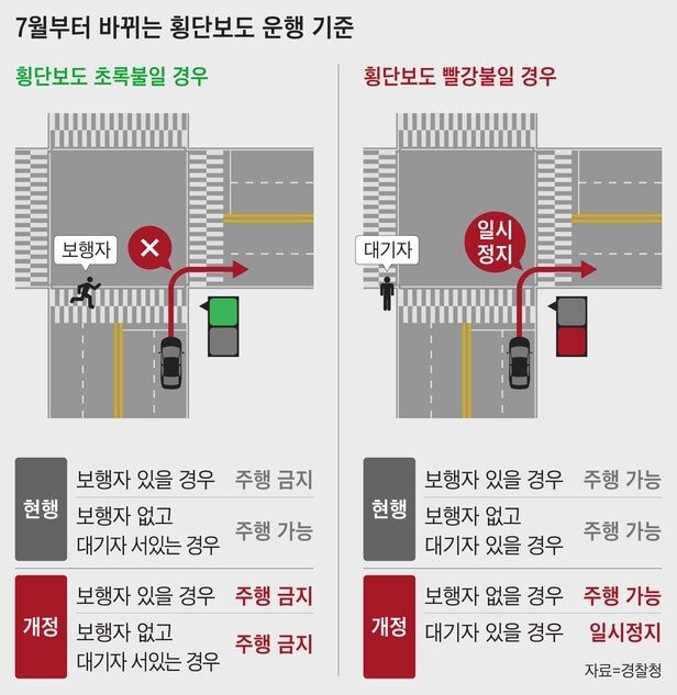 7월 12일부터 개정되는 도로교통법에 따라 횡단보도에 보행자가 있을 때 뿐 아니라 보행자가 건너려고 할 때도 운전자는 무조건 일시 정지를 해야합니다.
