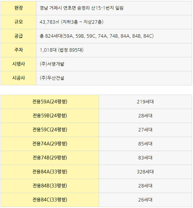 거제 두산위브 더 포레스트의 위치는 "경남 거제시 연초면 송정리 산 15 - 1외 필지" 일대에서 824세대가 건설이 되며 사업시행자는 (주)서영개발이 모든 인허가 절차를 마무리하고 2022년 3월 29일 착공식을 진행하여 공사를 하고 있습니다.