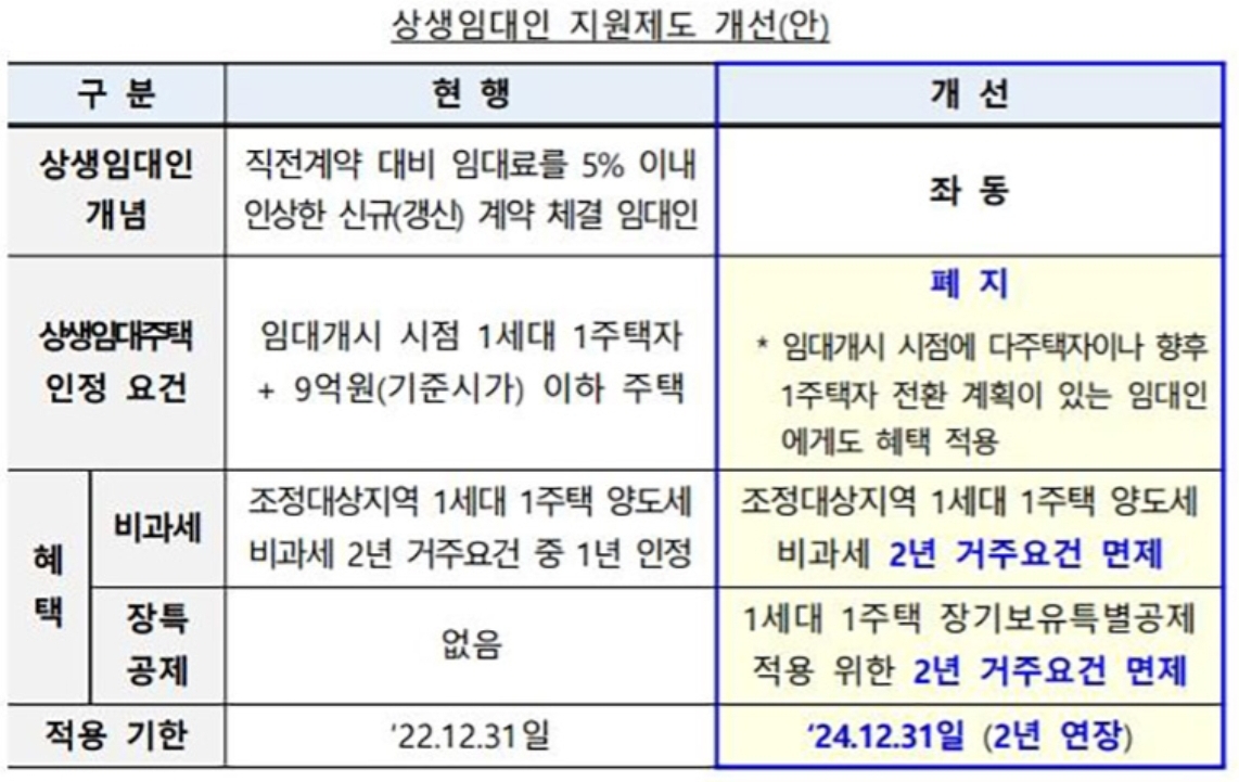 지금은 상생임대인이 임대 개시 시점에 기준시가 9억 원 이하, 2년 이상 임대한 주택에 대해 조정대상지역 1세대 1주택 양도소득세 비과세 2년 거주 요건 중 1년을 인정하고 있는데, 오는 2024년 말까지는 2년 거주 요건을 아예 면제해주기로 했습니다.