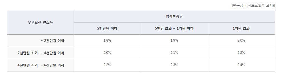 * 부부합산 총소득이 5천만원 이하 및 순 자산 기준금액이 2.88억원 이하 및 순자산 기준금액이 2.88억원 이하의 부양가족 전원이 무주택인 경우 신청가능합니다.