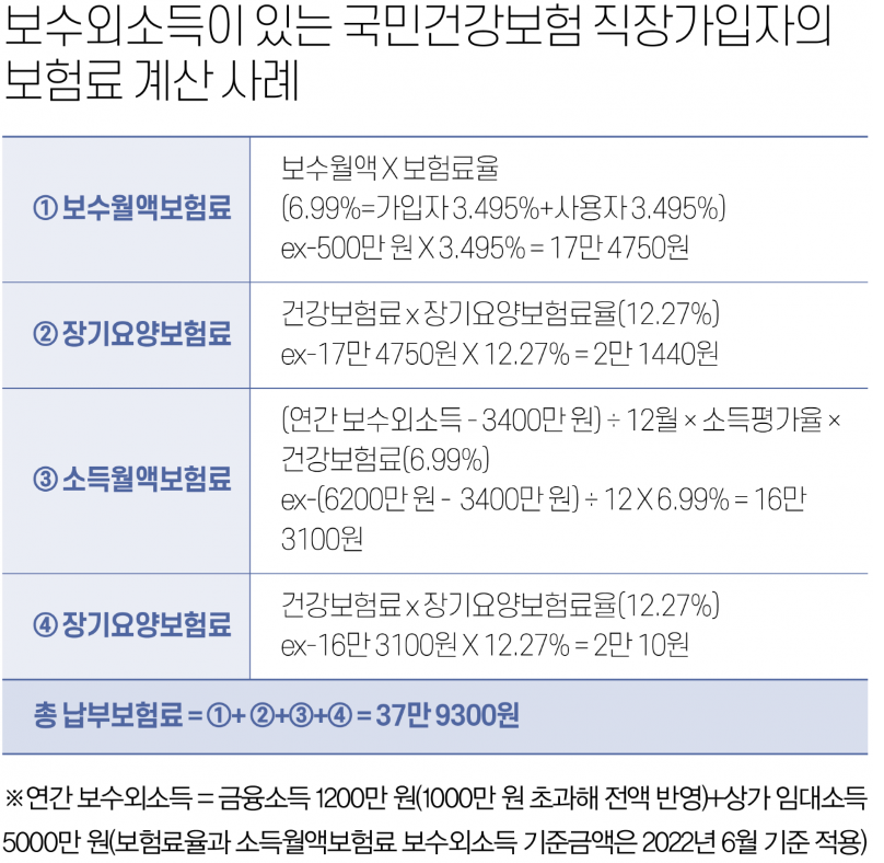 직장가입자의 보험료는 ‘보수월액보험료’와 ‘소득월액보험료’로 구성되며, 보험료율은 6.99%(2022년 기준)로 동일합니다. 보수월액이란 직장가입자가 당해 연도에 받는 보수 총액을 근무 월수로 나눈 금액을 말하며, 소득월액은 직장가입자의 보수외소득(이자, 배당, 사업, 근로, 연금, 기타소득)을 말합니다.