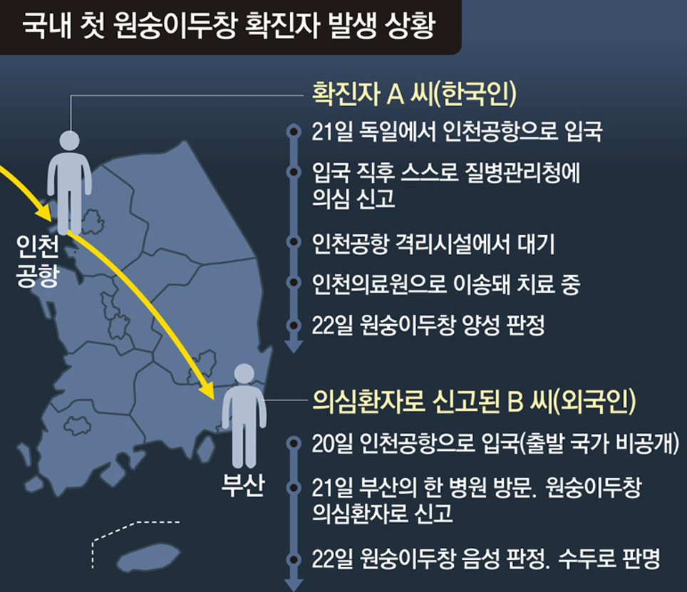 질병청에 따르면 A 씨는 18일부터 두통 증상을 보였으며, 21일 오후 4시경 인천국제공항을 통해 입국했을 때는 피부병과 함께 37도의 미열, 인후통 등의 증상이 나타나 A씨 스스로 신고해 격리 상태로 병상으로 옮겨졌습니다. 이로 인하여 항공기 동승객 외에 별 다른 접촉자가 없는 것으로 파악됐으며 A 씨는 큰 이상 없이 회복 중인 것으로 알려졌습니다.