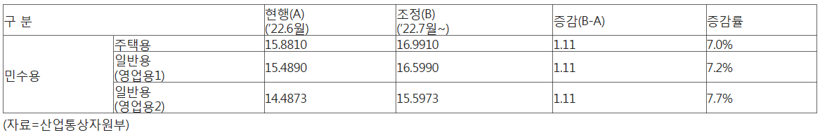 - 주택용 요금 16.99원 7.0% 인상