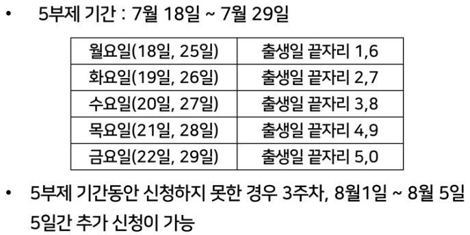 출생일 구분으로 5부제 시행(7월 18일 ~ 22일)