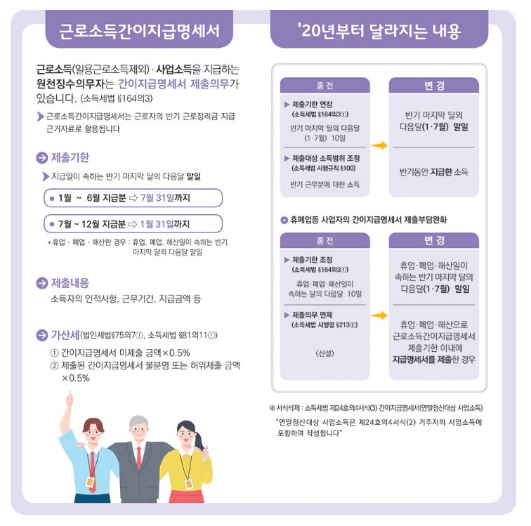 반기신청은 근로소득 또는 원천징수사업소득이 지급일이 속하는 반기 마지막 달의 다음달(7월, 1월) 말일까지 근로소득간이지급명세서·사업소득간이명세서가 제출되야합니다.