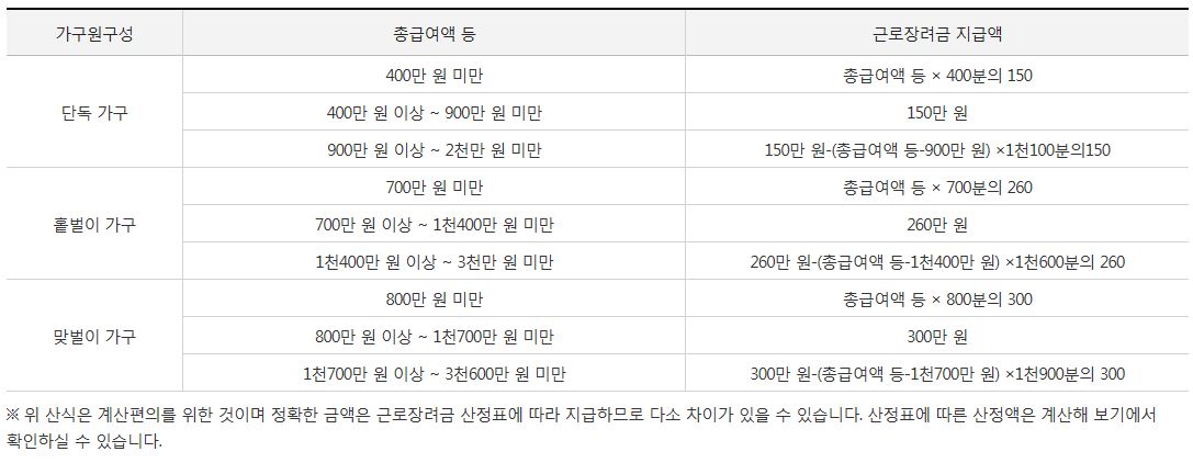 * 재산합계액 1억4천만원 이상 2억원 미만인 자는 근로·자녀장려금 산정액의 50%만 지급됩니다.