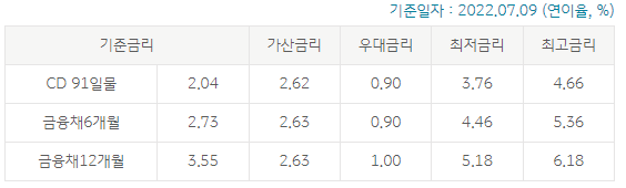 - 고객별 적용금리는 기준금리, 가산금리 및 실적연동 우대금리 등에 따라 차등 적용됩니다.