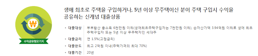 공유 모기지 상품은 "집값 상승 시 수익을 정부"와 공유하는 대출상품입니다.정부와 공유하는 대신 " 연 1.5%"의 낮은 금리를 적용받을 수 있는 "수익 공유형 모 고지 대출상품"입니다.