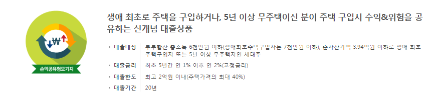공유 모기지 상품은 "집값 상승 시 수익을 정부"와 공유하는 대출상품입니다. 정부와 공유하는 대신 " 연 1% ~ 2% "의 낮은 금리를 적용받을 수 있는 "손익 공유형 모 고지 대출상품"입니다.